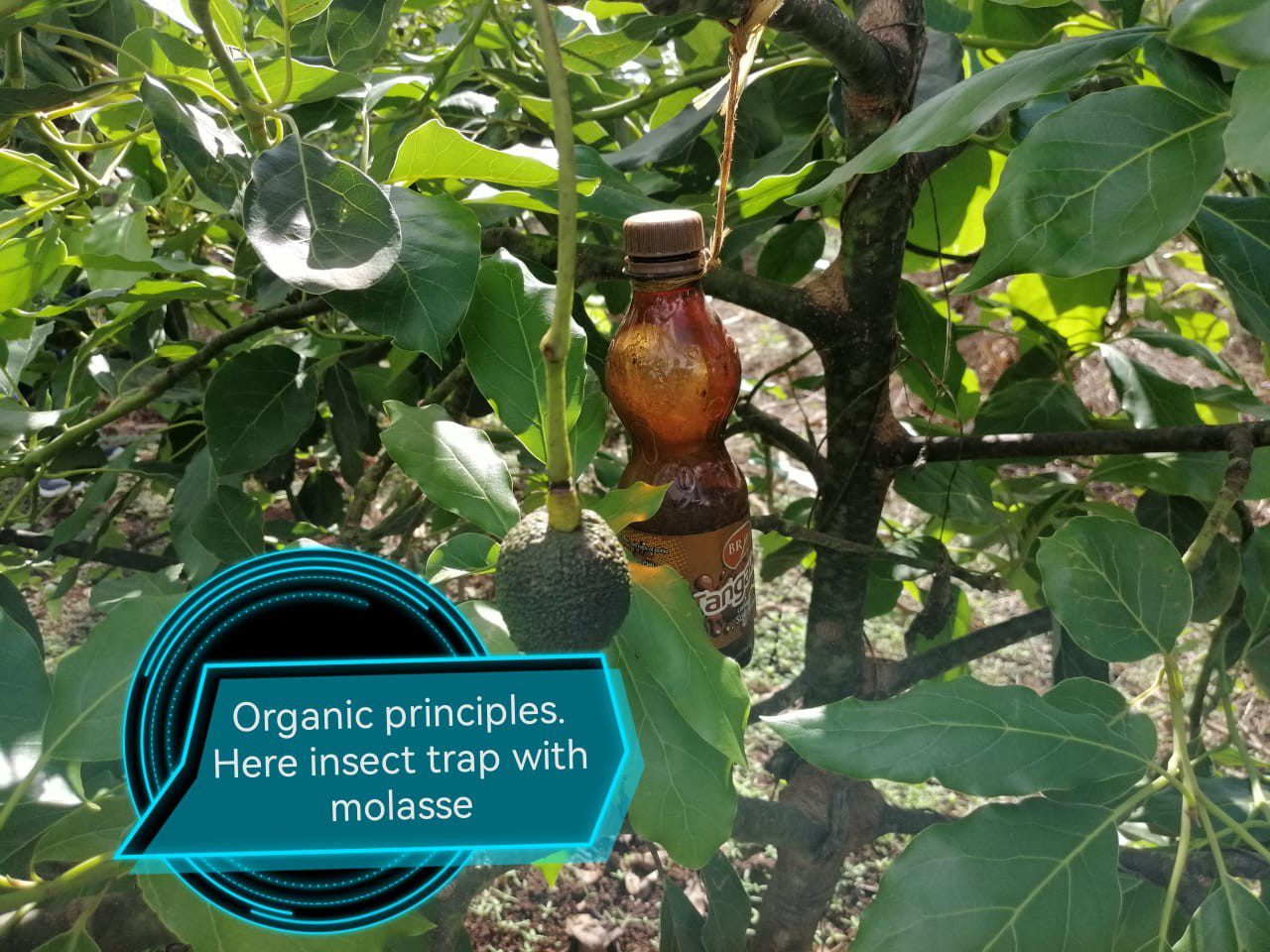 Organic method of controlling pests in fruit trees. In this innovation the farmer is using molasses processed from the sugarcane to control Wasp and mosquitos from Avocado trees. The quality of the fruit produced fetches better prices in the market because there are no chemical residues and no physical damage by pest. Additionally, the farmer has greatly reduced the cost of production because of no use of synthetic pesticides.