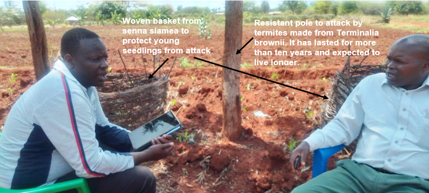 Resistant pole to attack by termites made from Terminalia brownii. It has lasted for more than ten years and expected to live longer. Woven basket from senna siamea to protect young seedlings from attack by livestock.